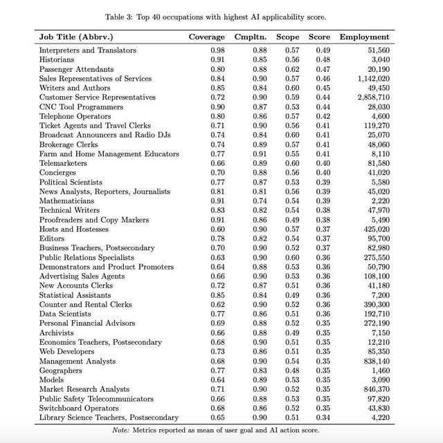 Microsoft released a study this year about the application of AI in the workplace and included 2 tables in the document that have done some rounds online. The 40 jobs that have the most AI applicability and the 40 jobs that have the least AI applicability. The jobs with the most AI applicability fall into data analysis and creative fields like writing and web design. The jobs with the least AI applicability are manual labor jobs and jobs where you need to use your body in a dextrous manner. This isn’t a 1:1 for AI job replacement as the study is targeted at how AI can be used to enhance performance, but as AI capabilities increase I feel there is a high chance these job markets could shrink.