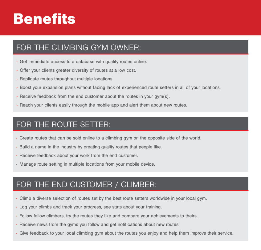 The two biggest points of note are from the gym owner section: Immediate access to quality routes and greater diversity of routes at a low cost. Why is the cost being lowered? It’s being lowered because you can now pay lower skilled laborers to put up pre-generated routes with no creative blocks and little setting experience.