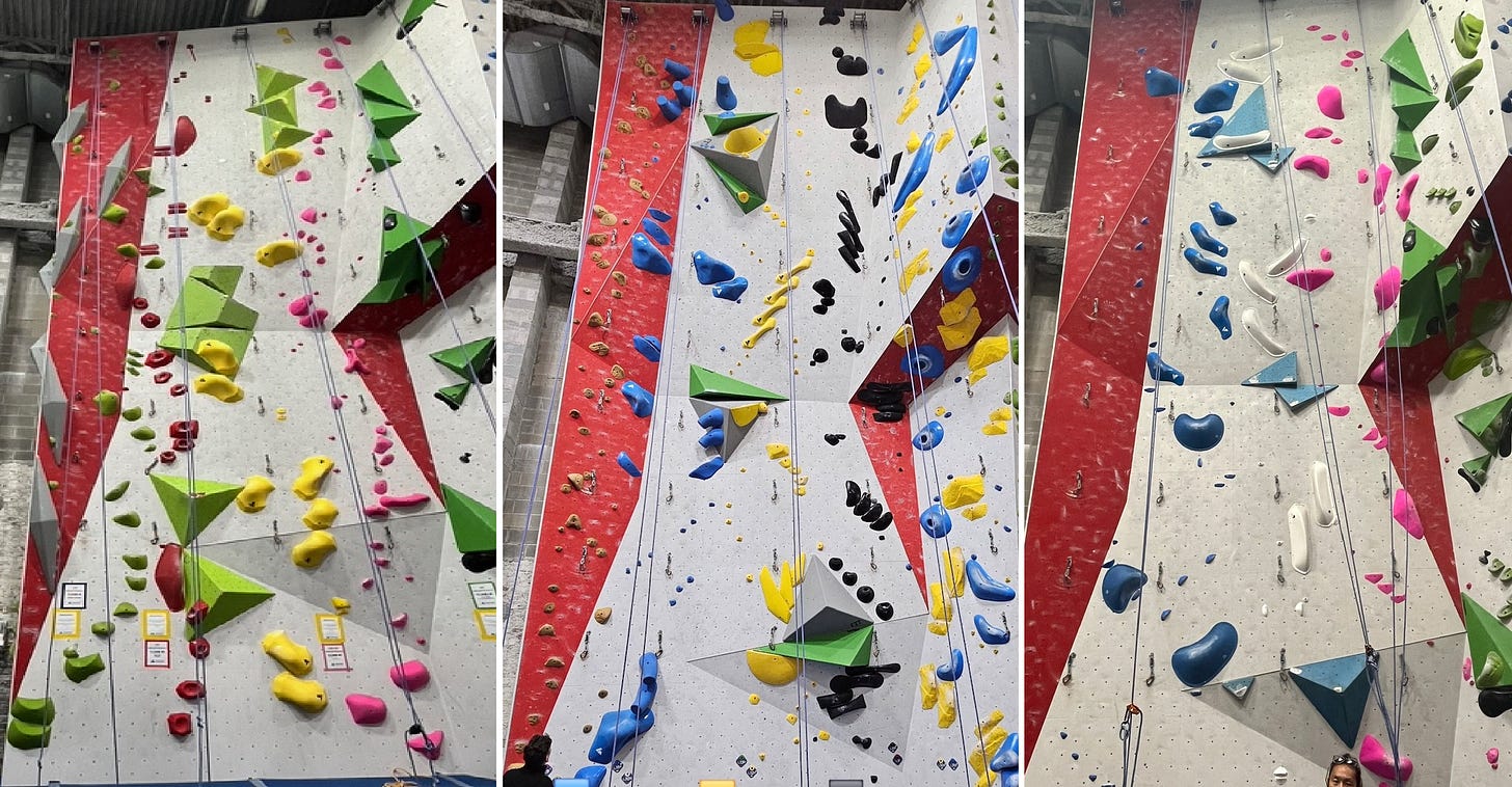 Sequencing: Deciphering beta is easier when you can break the route down into smaller parts. A 40ft wall with evenly spaced holds is harder to plan a course through than the same wall divided into 10ft sections. Overwhelming the climber can put them in a negative headspace before they even get on the wall.