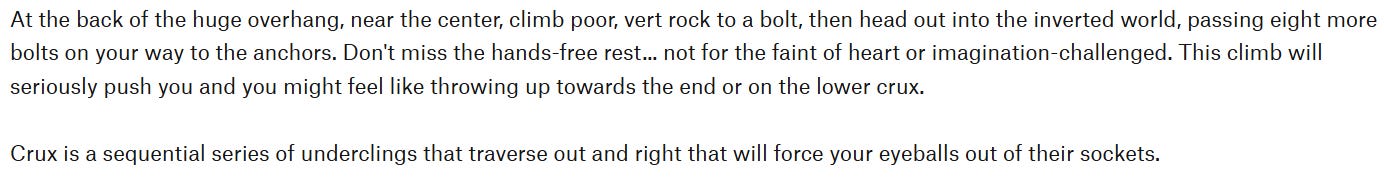 Climbers want routes to ebb and flow, and difficulty spikes are a way to take climbers out of this flow state. Setting 5.11d into a v5 boulder into 5.10d is just as disjointing to climb as it is to read. The abrupt combination of multiple aspects into a single route doesn’t leave the climber with a feeling of a smooth ride, it leaves them driving on a bumpy road. If you are looking to add a “boulder problem” into your route, you are adding additional complexities into an already multi-layered equation.