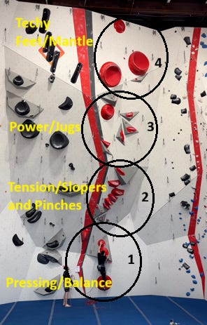 Resting positions: Climbers can plan out where they will be able to rest based on how the sections suit their style. A climber might opt to punch through a section they struggle with to get to a jug, while others might take a more consistent pace and be able to shake out on smaller holds